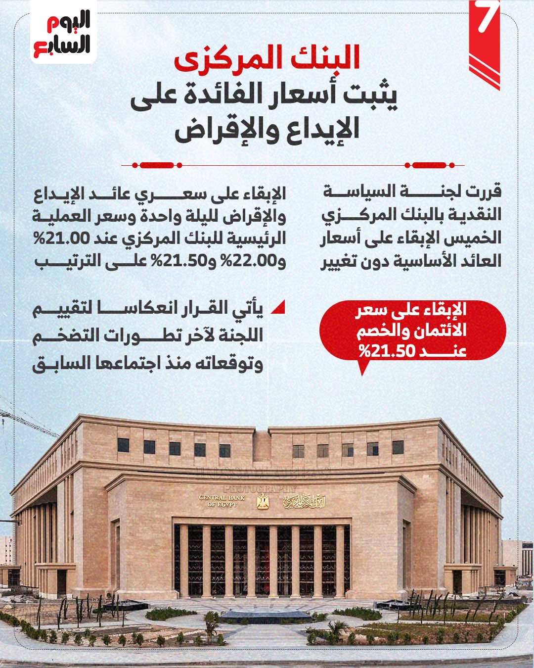 وقررت لجنة السياسة النقديـة للبنك المركزي المصري في اجتماعها اليوم، الإبقاء على سعري عائد الإيداع والإقراض لليلة واحدة وسعر العملية الرئيسية للبنك المركزي عند 21.00% و22.00% و21.50%، على الترتيب. كما قررت الإبقاء على سعر الائتمان والخصم عند 21.50%. ويأتي هذا القرار انعكاسا لتقييم اللجنة لآخر تطورات التضخم وتوقعاته منذ اجتماعها السابق.