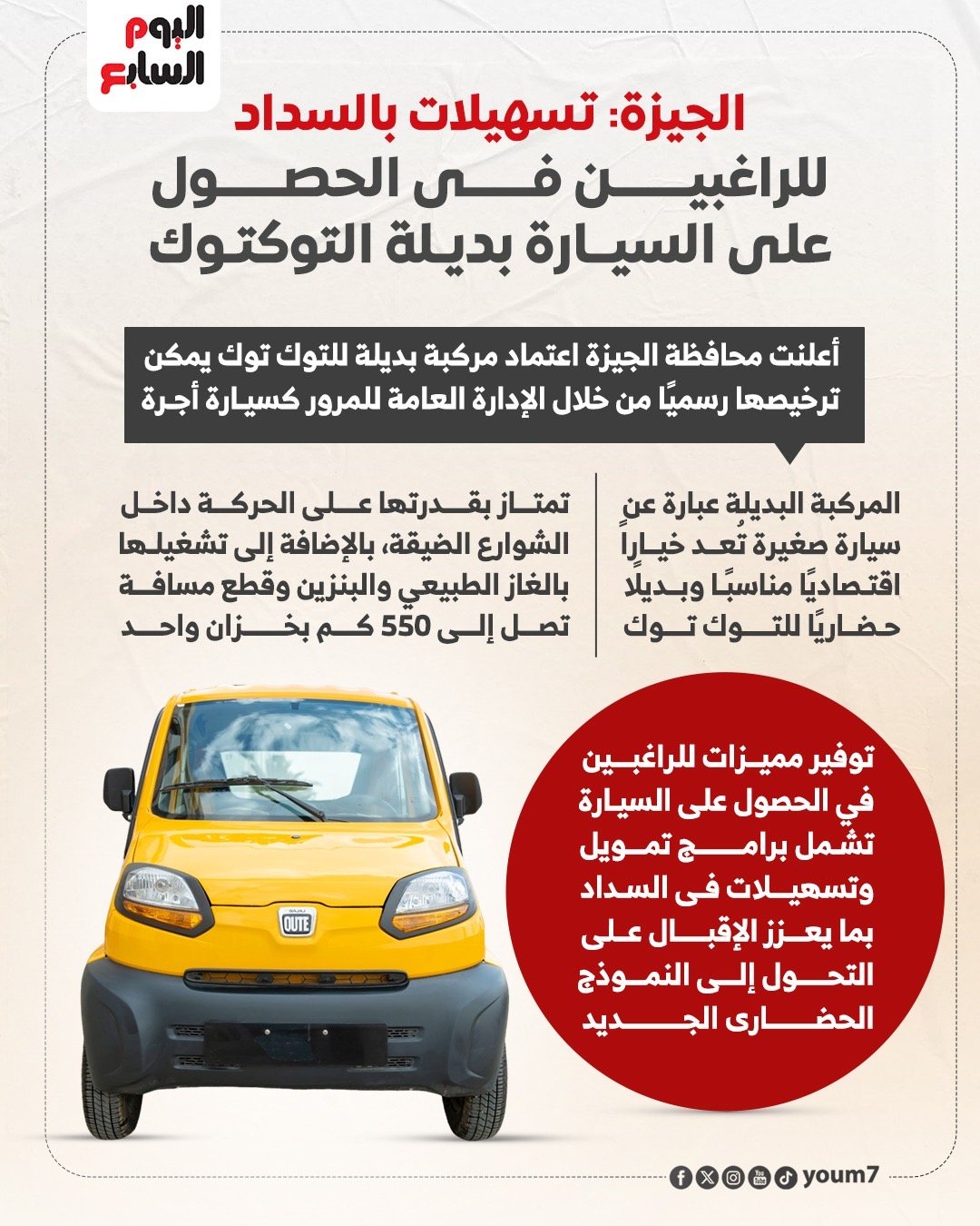وأعلن محافظ الجيزة بدء تنفيذ خطة المحافظة لاستبدال مركبات التوك توك بسيارات حضارية صغيرة، وذلك ضمن منظومة نقل حديثة تستهدف تحسين السيولة المرورية ورفع مستوى جودة الخدمات المقدمة للمواطنين.