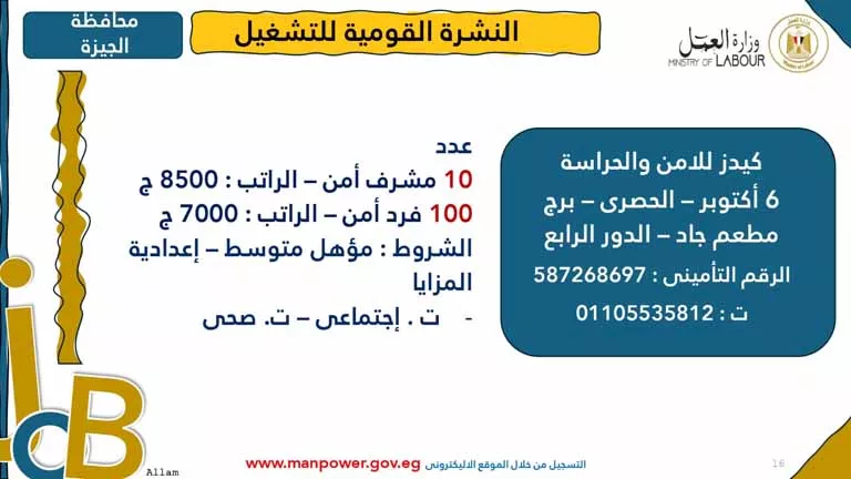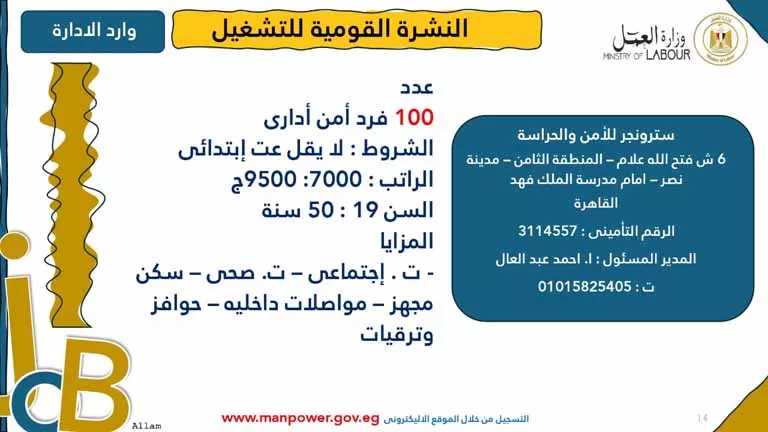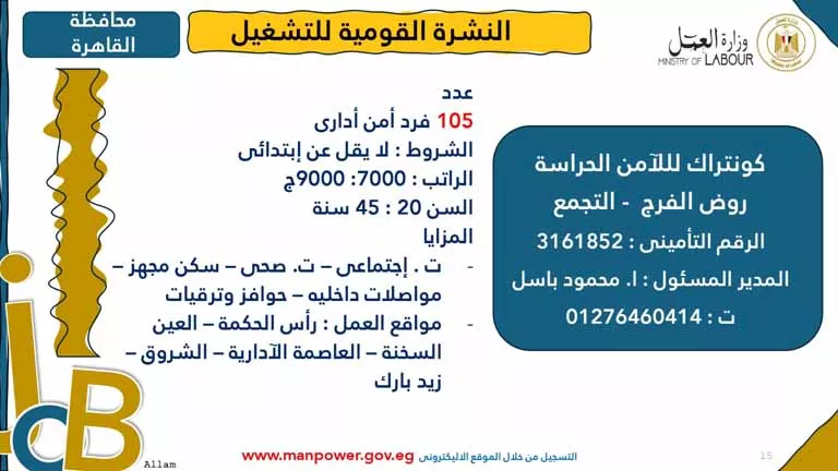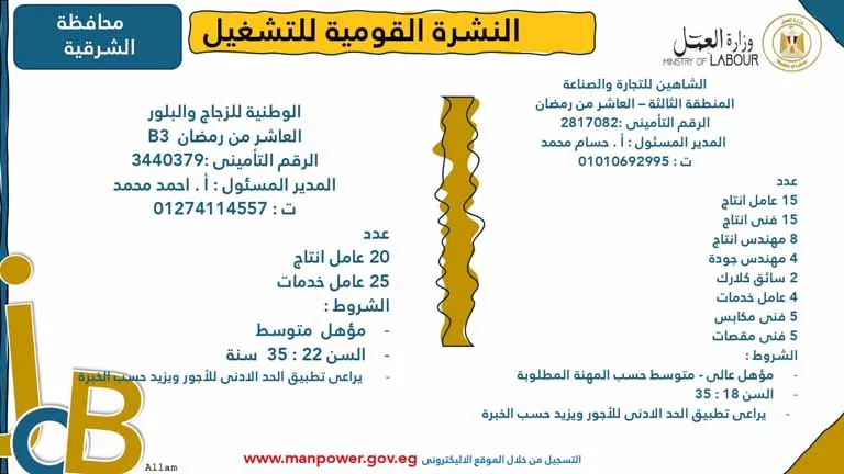 وأعلنت "العمل"، عن إتاحة 4202 فرصة عمل تقدمها 53 شركة خاصة موزعة على 14 محافظة على مستوى الجمهورية، مع رواتب مجزية تُحدد بعد المقابلات الشخصية، وضمان تطبيق الحد الأدنى للأجور، إضافة إلى التأمين الصحي والاجتماعي لجميع العاملين.