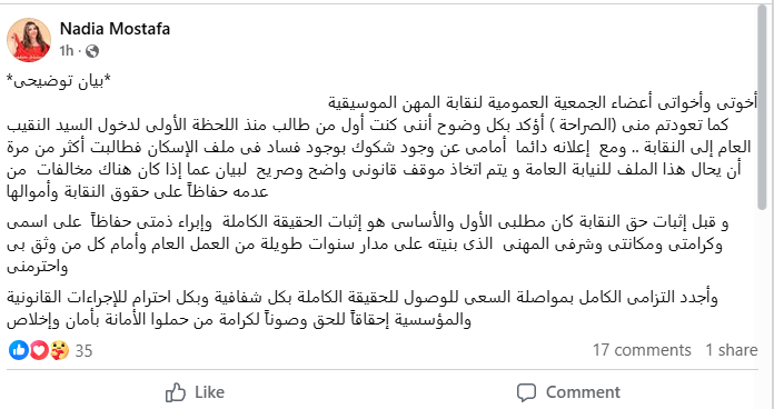 كشفت المطربة نادية مصطفى من خلال حسابها على موقع فيس بوك عن مطالبتها من قبل بإحالة ملف الإسكان داخل النقابة إلى النيابة مع الحديث عن وجود فساد به وذلك للرد علي هذا الأمر أمام الجميع، قائلة فى بيانها : "أخوتى وأخواتى أعضاء الجمعية العمومية لنقابة المهن الموسيقية، كما تعودتم منى (الصراحة ) أؤكد بكل وضوح أننى كنت أول من طالب منذ اللحظة الأولى لدخول السيد النقيب العام إلى النقابة .. ومع إعلانه دائما أمامى عن وجود شكوك بوجود فساد فى ملف الإسكان فطالبت أكثر من مرة أن يحال هذا الملف للنيابة العامة و يتم اتخاذ موقف قانونى واضح وصريح لبيان عما إذا كان هناك مخالفات من عدمه حفاظاً على حقوق النقابة وأموالها".