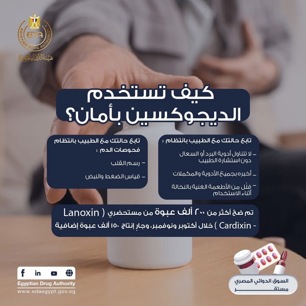 وقالت هيئة الدواء: لا تتناول أدوية البرد أو السعال دون استشارة الطبيب، وأخبر الطبيب بكل الأدوية أو الأعشاب التي تستخدمها، وانتبه لنظامك الغذائي (الأطعمة الغنية بالنخالة قد تقلل امتصاص الدواء). وأكدت هيئة الدواء المصرية توافر مستحضري Lanoxin وCardixin بكمية كافية.