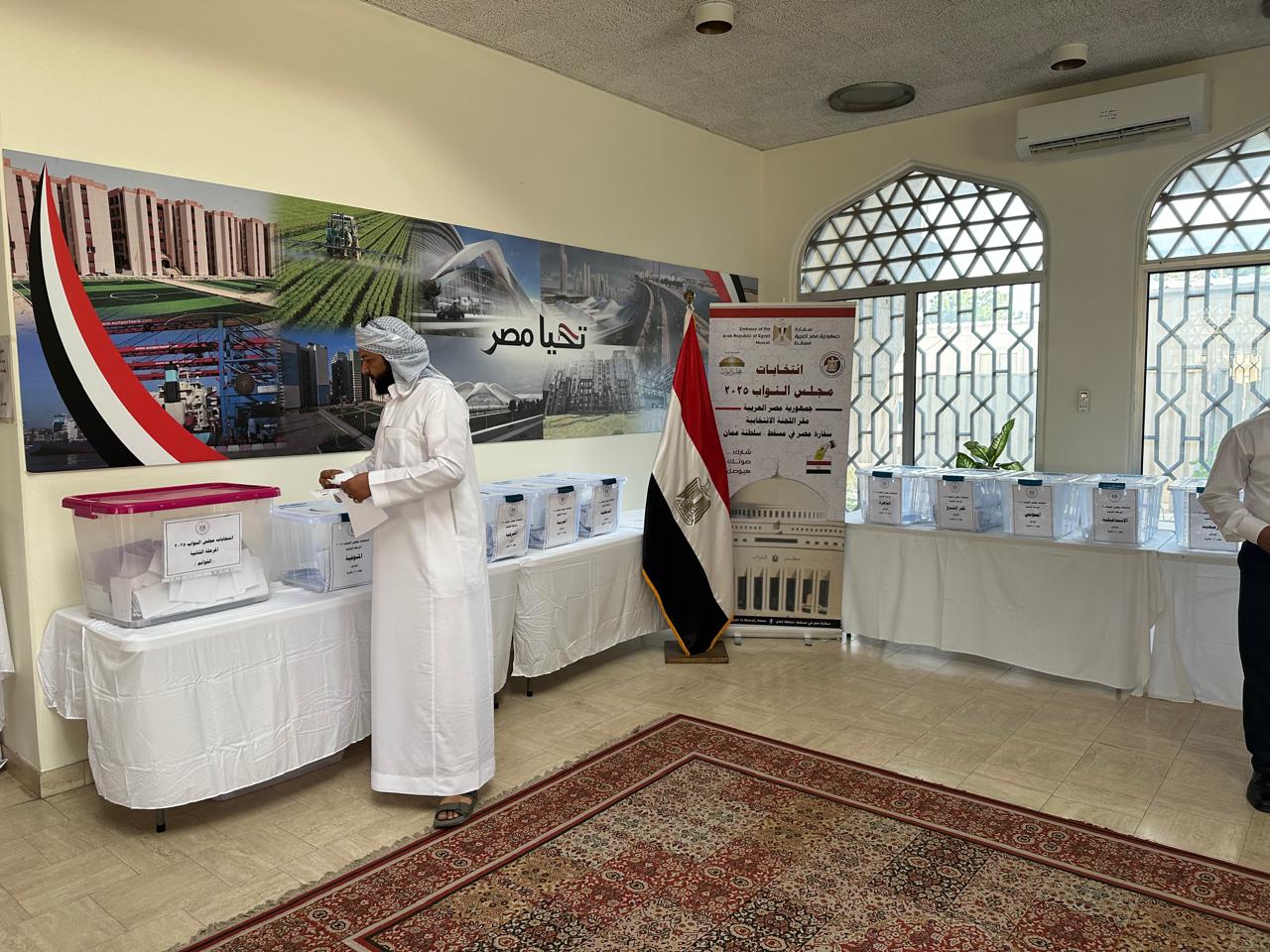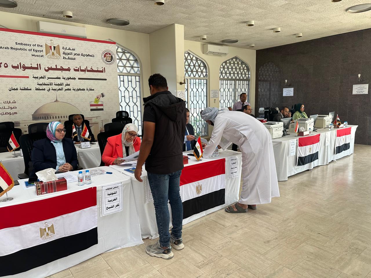 توافد المصريون فى سلطنة عمان على صناديق الاقتراع داخل مقر السفارة المصرية فى مسقط، للإدلاء بأصواتهم فى اليوم الثانى من المرحلة الثانية لانتخابات مجلس النواب 2025.