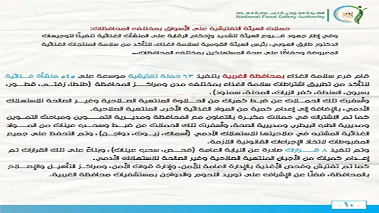 وقام فرع سلامة الغذاء بمحافظة كفر الشيخ بتنفيذ حملة تفتيشية مشتركة مع (مديرية التموين، جهاز حماية المستهلك، البيئة، الطب البيطري، الصحة، مجلس المدينة) شملت المرور على عدد من المنشآت الغذائية، بالإضافة إلى تنفيذ 21 حملة تفتيشية على السوق المحلي، شملت المرور على 235 منشأة غذائية، وأسفرت تلك الحملات عن إعدام كميات من المواد الغذائية المنتهية الصلاحية (لبن رايب، زبادي، صلصة، حلاوة طحينية، جبن، مخللات، مصنعات دواجن).
