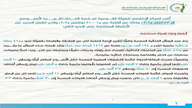 أصدر المركز الإعلامي للهيئة القومية لسلامة الغذاء تقريره الأسبوعي الـ 43 لعام 2025، عن الفترة من 15 - 21 نوفمبر، والذي تضمن العديد من الأنشطة المختلفة.