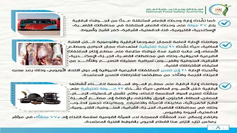 كما نفّذت إدارة وحدات الطعام المتنقلة عددًا من الجولات الرقابية بلغ 37 جولة على وحدات الطعام المتنقلة في محافظات القاهرة، الإسكندرية، القليوبية، قنا، الدقهلية، الشرقية، كفر الشيخ وأسيوط.