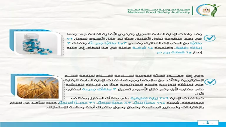وواصلت الإدارة العامة لتسجيل وترخيص الأغذية الخاصة جهودها في دعم منظومة تداول الأغذية، حيث تم خلال الأسبوع تسجيل 72 منتجًا من المكملات الغذائية، وفحص 453 منتجًا جديدًا، ونفذت 3 زيارات رقابية، واعتمدت 15 شركة عاملة في هذا القطاع، إلى جانب إصدار 15 شهادة بيع حر.
