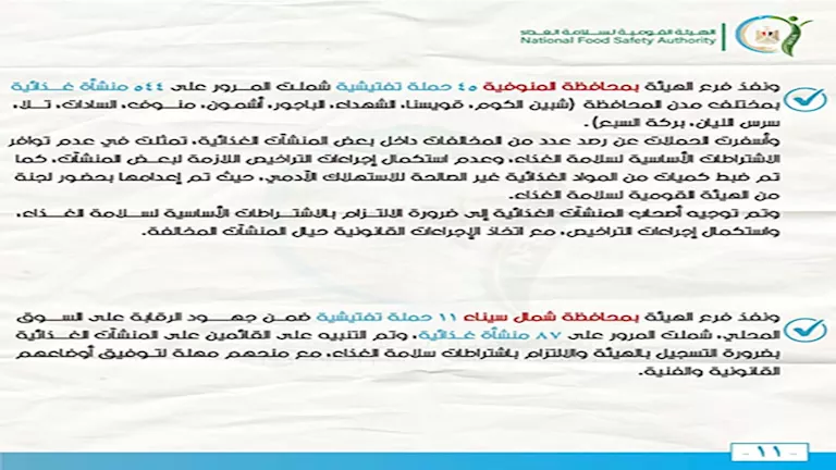 كما تم توعية أصحاب المنشآت الغذائية بضرورة تحسين التدابير الخاصة بسلامة الغذاء، مع أخد تعهدات منهم بالالتزام بتطبيق الاشتراطات الواجبة والتسجيل بالهيئة القومية لسلامة الغذاء.