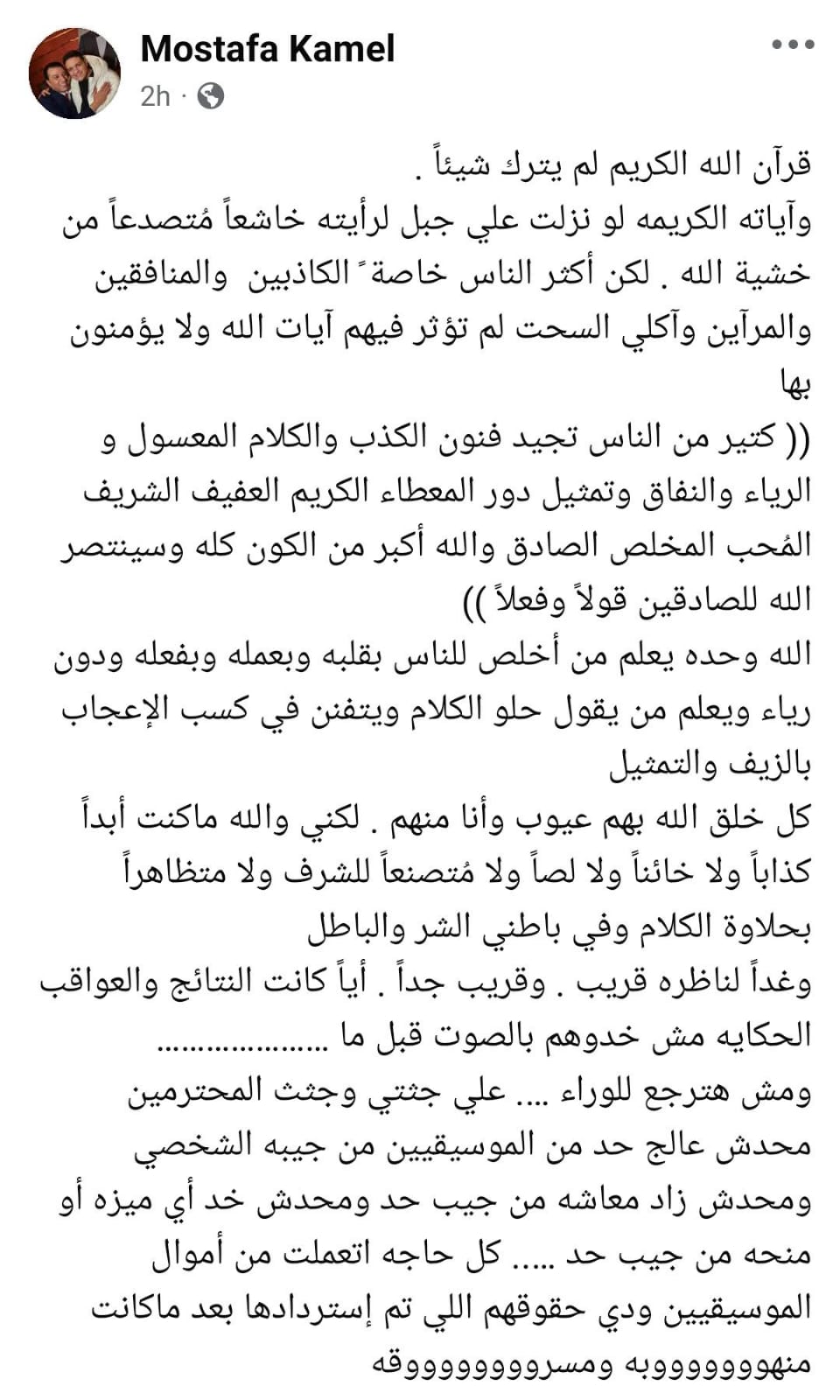 نشر الفنان مصطفى كامل نقيبب الموسيقيين، عبر حسابه الشخصى على موقع التواصل الاجتماعى فيس بوك، قائلا: قرآن الله الكريم لم يترك شيئاً، وآياته الكريمة لو نزلت على جبل لرأيته خاشعاً مُتصدعاً من خشية الله، لكن أكثر الناس خاصة الكاذبين والمنافقين والمرآين وآكلي السحت لم تؤثر فيهم آيات الله ولا يؤمنون بها.
