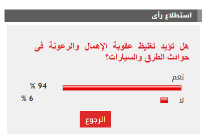 وأيد 94% من القراء تغليظ عقوبة الإهمال والرعونة فى حوادث الطرق والسيارات، بينما رفض 6% موضوع الاستطلاع.