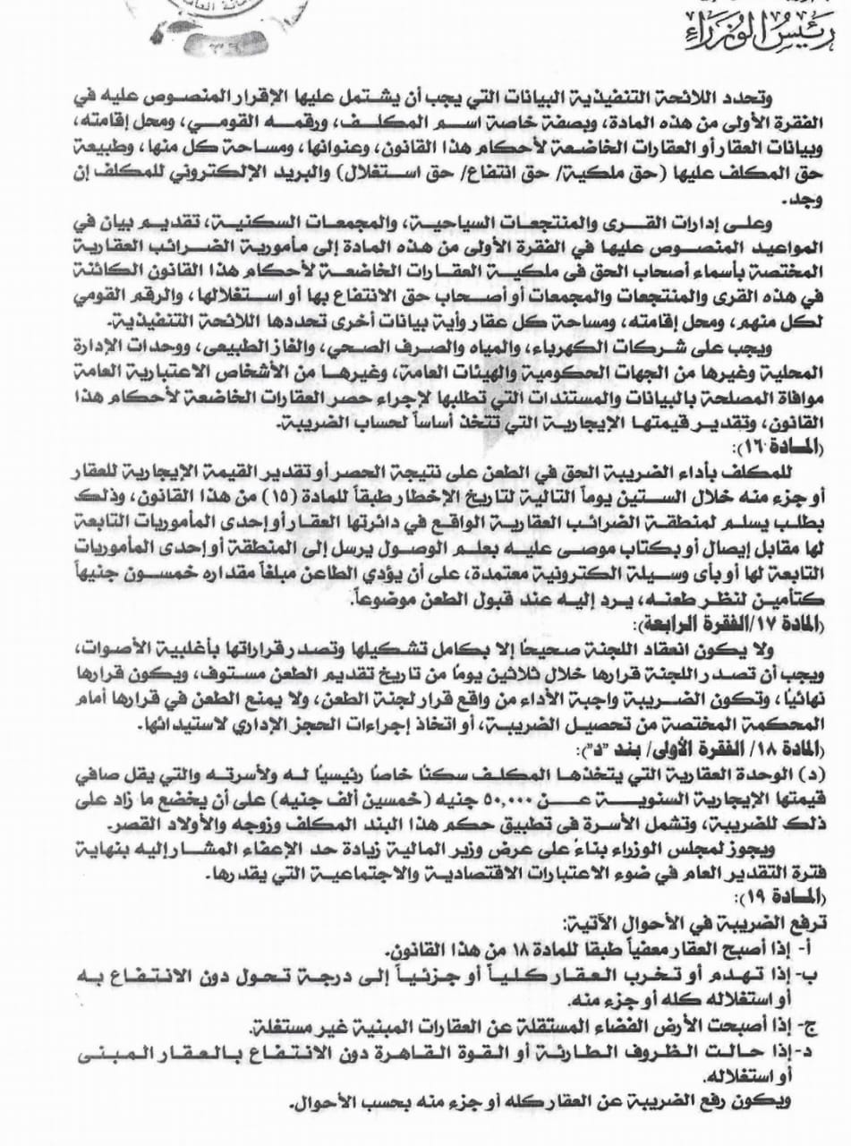 وتحدد اللائحة التنفيذية البيانات التي يجب أن يشتمل عليها الإقرار المنصوص عليه في الفقرة الأولى من هذه المادة، وبصفة خاصة اسم المكلف، ورقمه القومي، ومحل إقامته وبيانات العقار أو العقارات الخاضعة لأحكام هذا القانون، وعنوانها ، ومساحة كل منها ، وطبيعة حق المكلف عليها حق ملكية حق انتفاع حق استغلال) والبريد الإلكتروني للمكلف إن وجد.