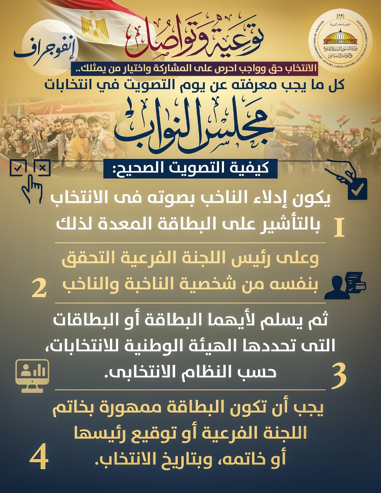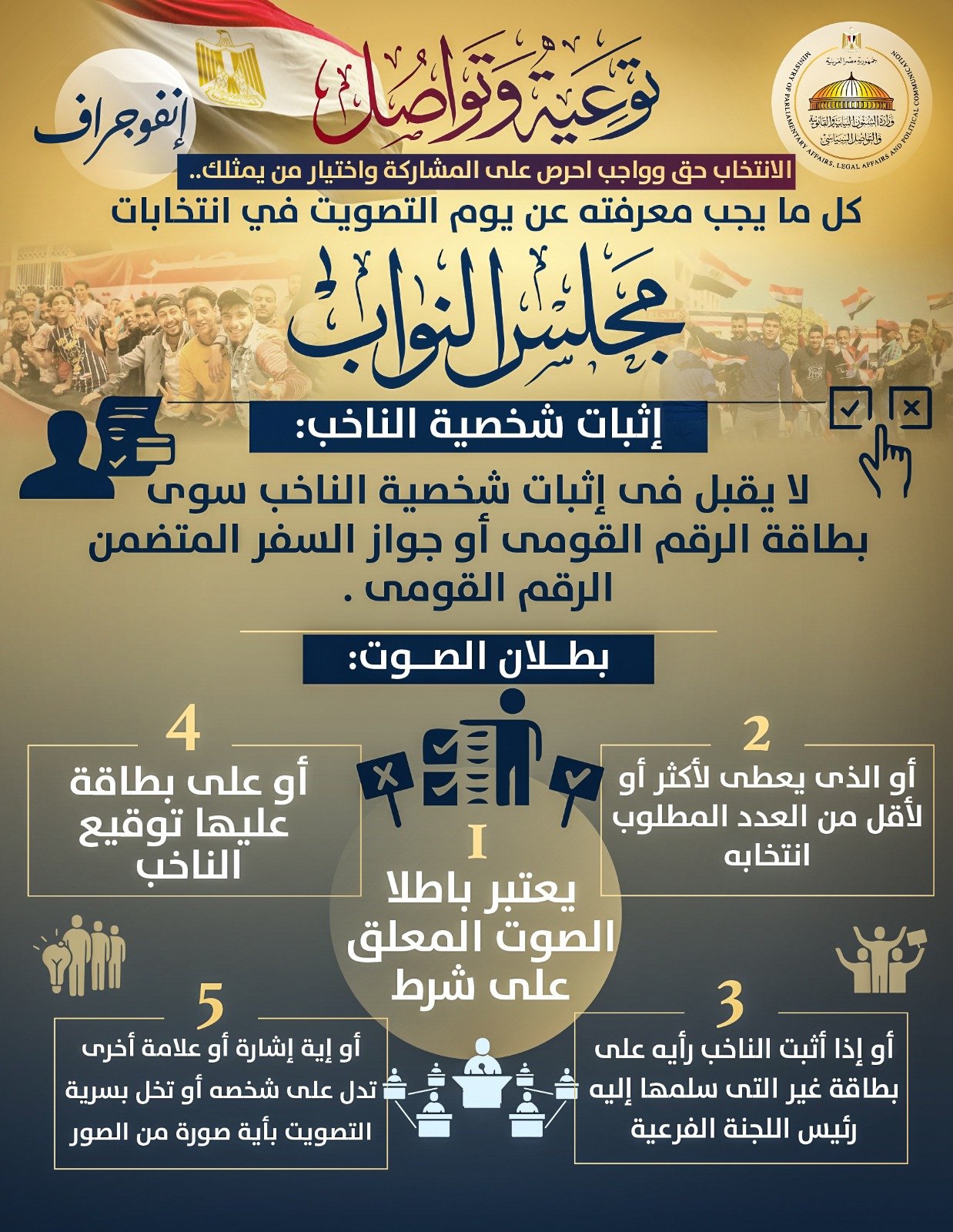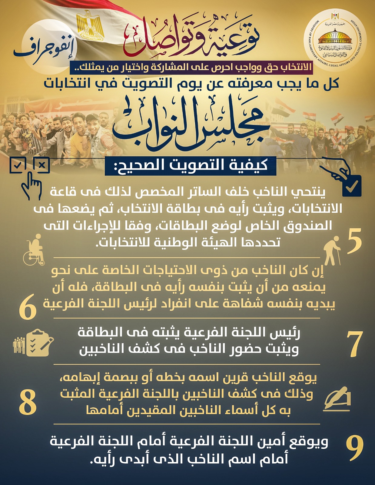 أصدرت وزارة الشؤون النيابية والقانونية والتواصل السياسي، اليوم الإثنين 24 نوفمبر 2025، بيانًا أعلنت فيه نشر سلسلة جديدة من محتوى "توعية وتواصل" بعنوان: "الانتخاب حق وواجب.. احرص على المشاركة واختيار من يمثلك.. كل ما يجب معرفته عن يوم التصويت في المرحلة الثانية من انتخابات مجلس النواب".