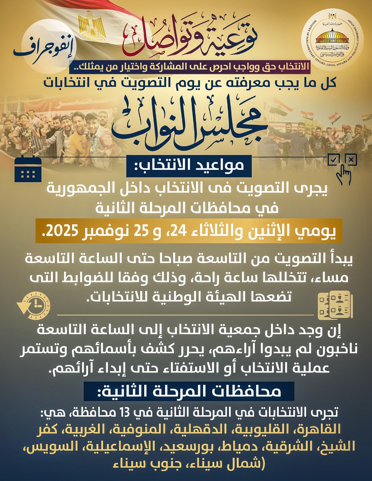 وأشار البيان، إلى أن انتخابات مجلس النواب 2025 جرت في الخارج يومي الجمعة والسبت 21 و22 نوفمبر، بينما تجري عملية التصويت في الداخل لمحافظات المرحلة الثانية اليوم الإثنين وغدًا الثلاثاء 24 و25 نوفمبر 2025، من التاسعة صباحًا وحتى التاسعة مساءً، مع تخصيص ساعة راحة وفق ضوابط الهيئة الوطنية للانتخابات.