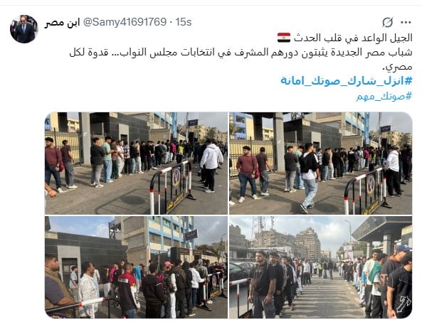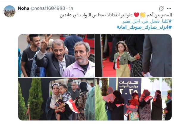 كما نشر حساب باسم نهي، صور لطوابير الناخبين في منطقة عابدين بمحافظة القاهرة، وعلقت عليها: "المصريين أهم طوابير انتخابات مجلس النواب في عابدين"، وشارك حساب آخر على الهاشتاج بنشر صور لطوابير الشباب في ماراثون الانتخابات، وعلق عليها: "الجيل الواعد في قلب الحدث شباب مصر الجديدة يثبتون دورهم المشرف في انتخابات مجلس النواب.. قدوة لكل مصري".