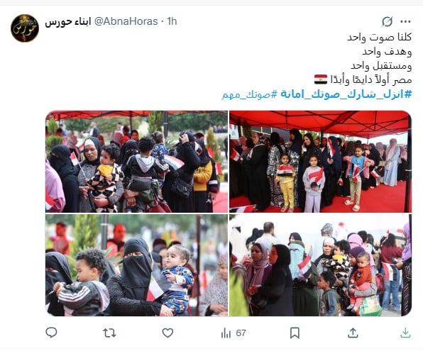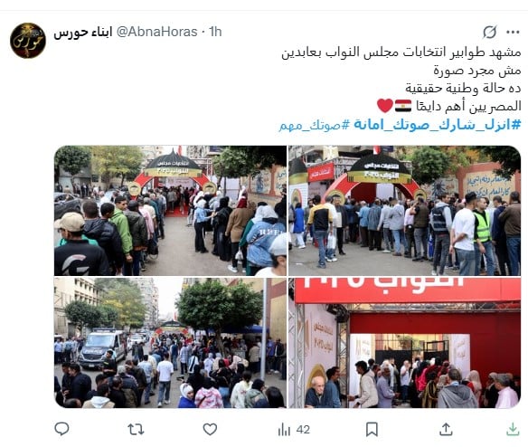 ومن جانبه، كتب حساب باسم أبناء حورس: "كلنا صوت واحد وهدف واحد ومستقبل واحد مصر أولاً دايمًا وأبدًا"، وذلك في تعليقه على صور تبرز طوابير الناخبين أمام اللجان، وأضاف في تدوينه أخري: "مشهد طوابير انتخابات مجلس النواب بعابدين مش مجرد صورة ده حالة وطنية حقيقية المصريين أهم دايمًا".