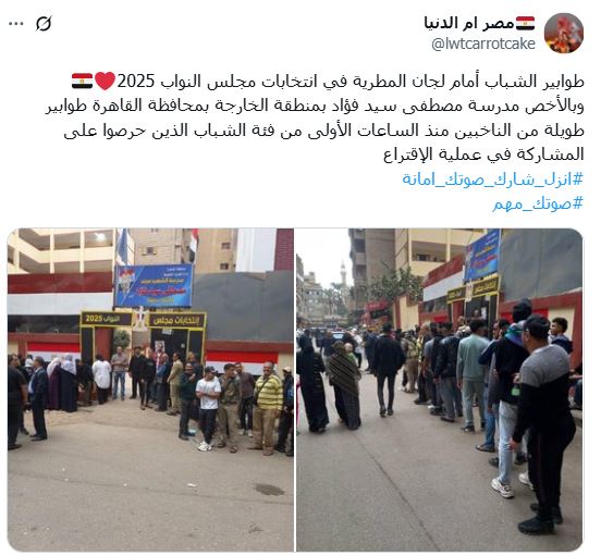 في إطار ذلك، نشر حساب يحمل اسم مستعار "مصر أم الدنيا" صورًا من أمام مدرسة مصطفى سيد فؤاد بمنطقة الخارجة بمحافظة القاهرة، تُظهر طوابير طويلة من الشباب الذين حرصوا على المشاركة في عملية الإقتراع.