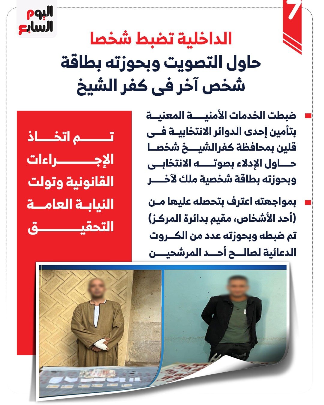 تمكنت الخدمات الأمنية المعنية بتأمين إحدى الدوائر الإنتخابية بدائرة مركز شرطة قلين بمحافظة كفرالشيخ من ضبط (أحد الأشخاص ، مقيم بدائرة المركز) حال محاولته الإدلاء بصوته الإنتخابى وبحوزته بطاقة شخصية ملك لآخر ، وبمواجهته إعترف بتحصله عليها من ( أحد الأشخاص ، مقيم بدائرة المركز ) تم ضبطه ، وبحوزته عدد من الكروت الدعائية لصالح أحد المرشحين.