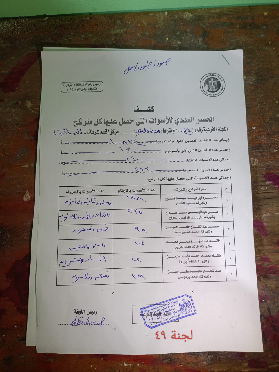 انتهت اللجنة الفرعية رقم 49 بدائرة دار السلام والبساتين محافظة القاهرة من عملية الفرز ، وجاء اجمالى من لهم حق التصويت 10834 بينما جاء عدد المصوتين 603 وجاءت الأصوات الباطلة 140 وجاءت الارقام الصحيحة 463