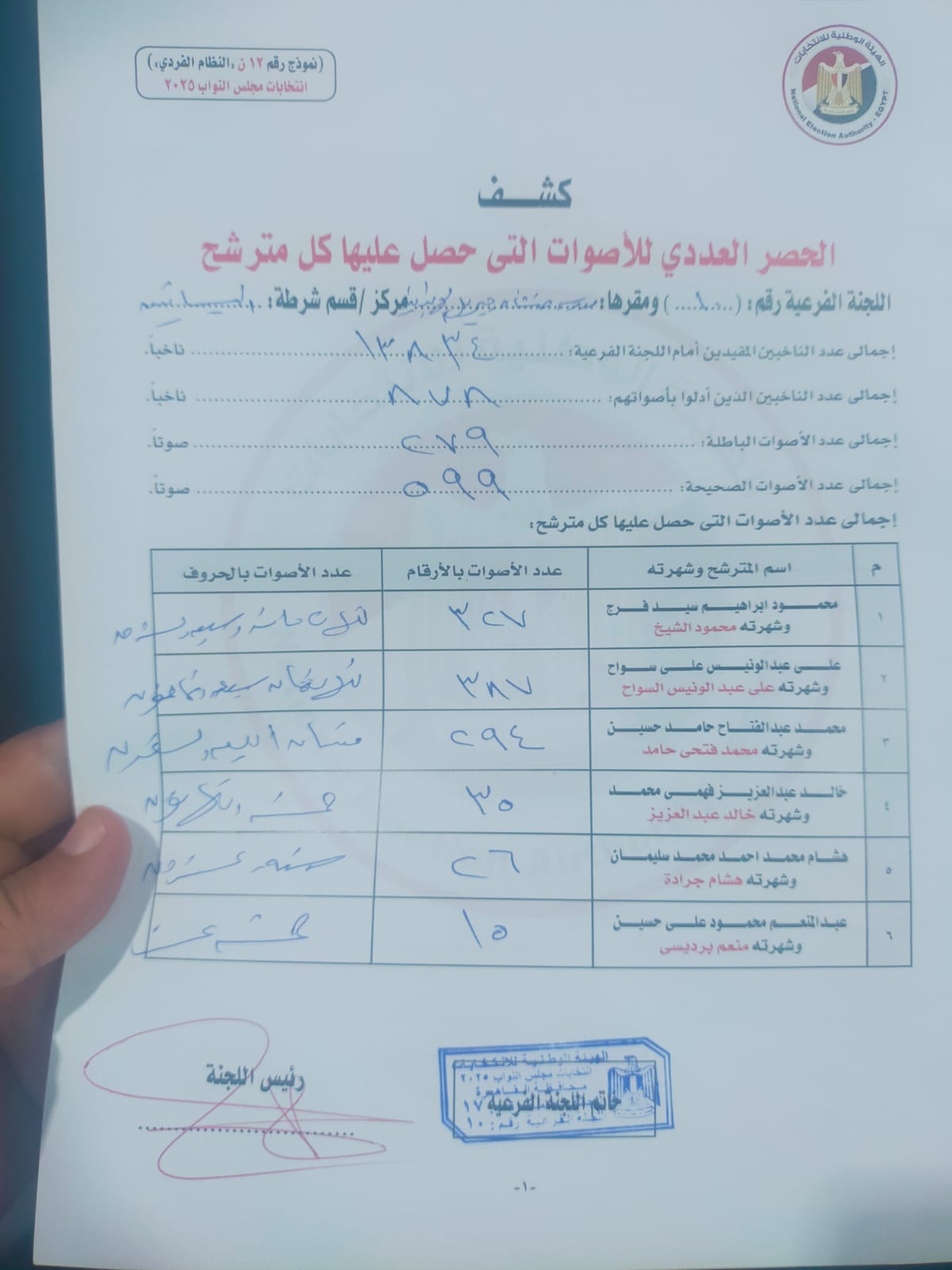 ويعلن كل رئيس لجنة فرعية العدد الحصرى للأصوات، وهو عدد الناخبين المقيدين أمام اللجنة الفرعية، وعدد من أدلوا بأصواتهم وعدد الأصوات الصحيحة والباطلة وعدد االناخبين المقيدين أمام اللجنة الفرعية، وعدد من أدلوا بأصواتهم وعدد الأصوات الصحيحة والباطلة وعدد الأصوات التي حصل عليها كل مرشح أو قائمة.