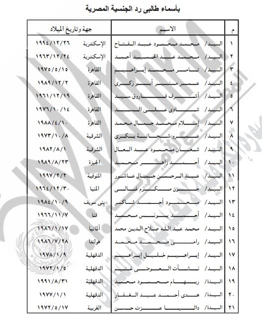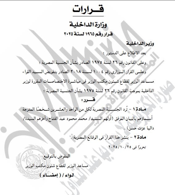 نشرت الجريدة الرسمية قرار وزارة الداخلية رقم 1965 لسنة 2025، بشأن رد الجنسية المصرية لـ 21 شخصا.