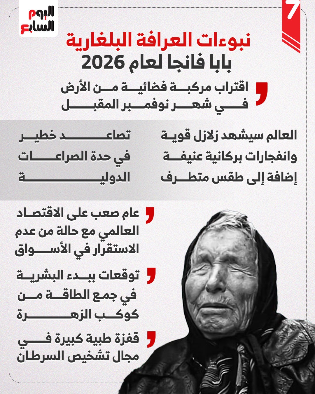 زلازل عنيفة.. أبرز نبوءات العرافة البلغارية بابا فانجا لعام 2026 (إنفوجراف)