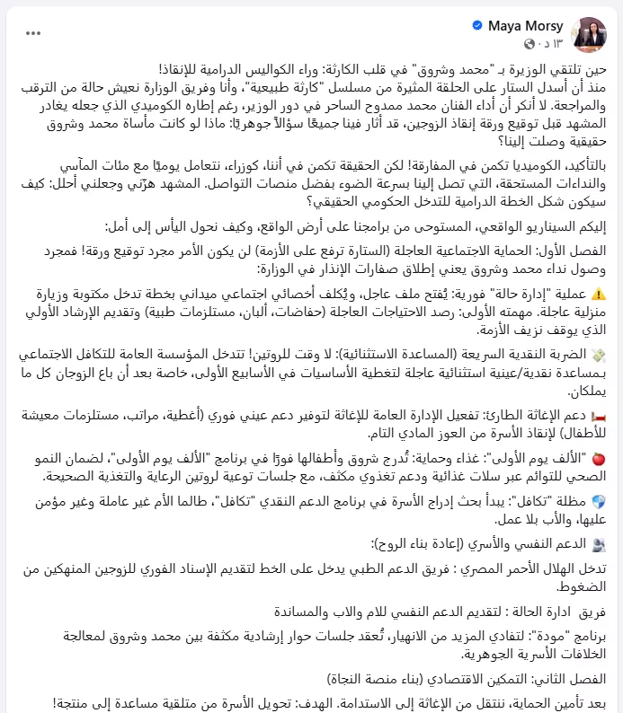 وقالت وزيرة التضامن، في منشور لها عبر صفحتها الشخصية بموقع التواصل الاجتماعي "فيسبوك": إن المشهد الدرامي، رغم طابعه الكوميدي، أثار سؤالًا مهمًا داخل الوزارة: كيف سيكون التدخل الحقيقي لو واجهنا مأساة مشابهة؟ مؤكدة أن الوزارة تتعامل يوميًا مع مئات الحالات الطارئة، وتستجيب للبلاغات التي تصل من المواطنين عبر منصات التواصل في أسرع وقت.