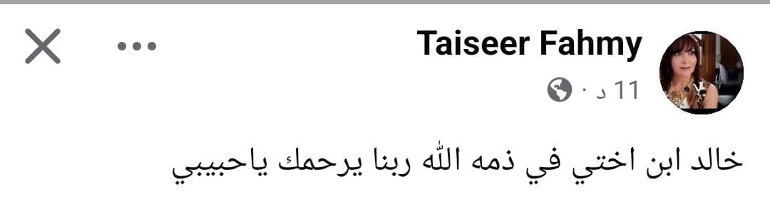 كشفت الفنانة تيسير فهمي عن وفاة خالد ابن شقيقتها، وذلك عبر حسابها على السوشيال ميديا، حيث كتبت: "خالد ابن أختي في ذمة الله ربنا يرحمك يا حبيبي".