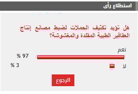 وأيد 97% من القراء تكثيف الحملات لضبط مصانع إنتاج العقاقير الطبية المقلدة والمغشوشة، بينما رفض 3% مطالب تكثيف الحملات لضبط مصانع إنتاج العقاقير الطبية المقلدة والمغشوشة.