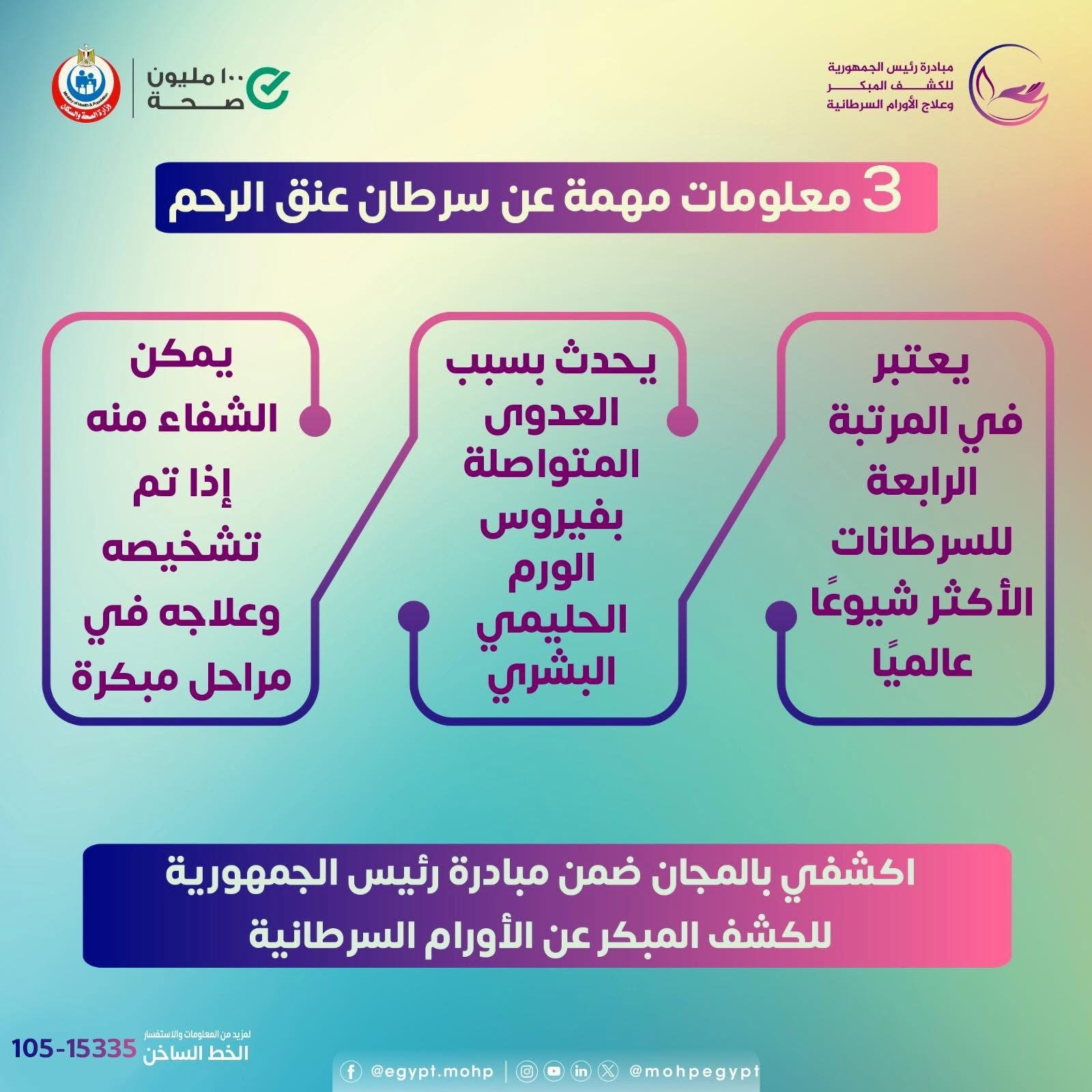 قالت وزارة الصحة والسكان إن هناك 3 معلومات هامة عن سرطان عنق الرحم يجب الحرص على معرفتهم، وهم: