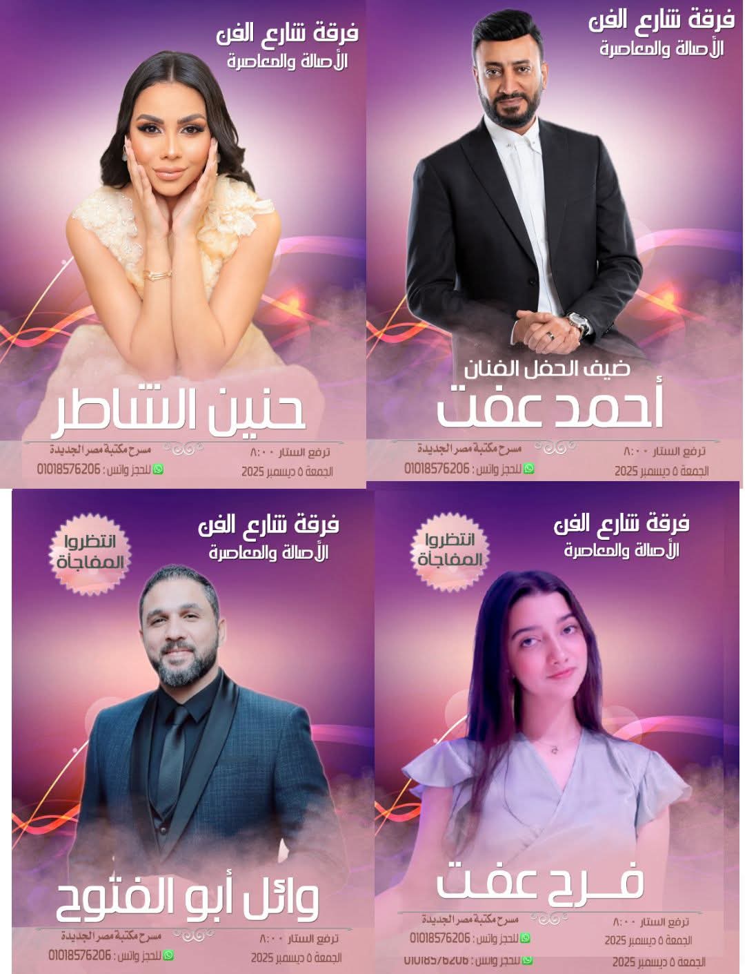 تقيم فرقة شارع الفن حفلاً غنائية بعنوان " الاصالة والمعاصرة" يوم الجمعة المقبل الموافق 5 ديسمبر بمكتبة مصر الجديدة، يحيها كل من الفنان احمد عفت والفنانة حنين الشاطر والفنانة فرح عفت والفنان وائل ابو الفتوح تحت قيادة المايسترو إيهاب عبد الحميد ويقدم نجوم الفرقة فاصلا مميزا من أغانى الزمن الجميل لـ أم كلثوم وعبد الحليم حافظ و محمد العزبى ومحمد رشدى و وردة و فايزة أحمد و صباح و شادية.