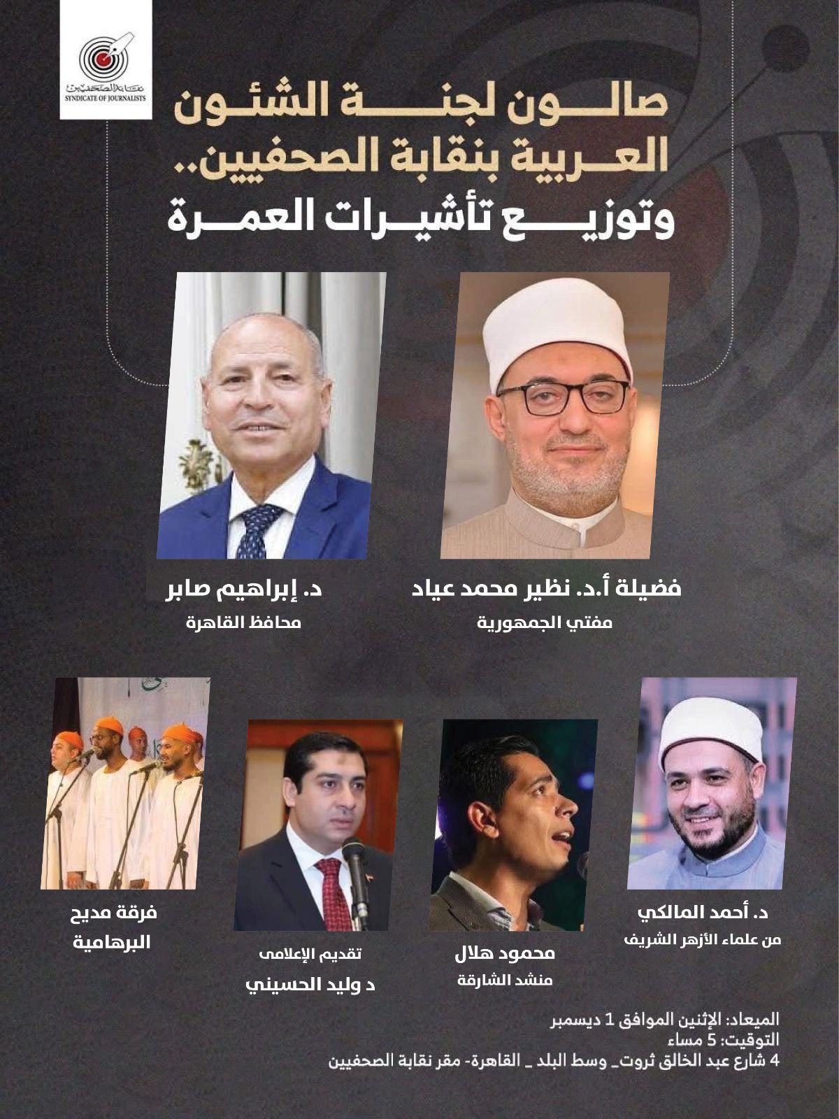 تستضيف لجنتا الشئون العربية والخارجية والحج والعمرة بنقابة الصحفيين، برئاسة محمد السيد الشاذلى، فضيلة الدكتور نظير محمد عياد، مفتي الجمهورية، والدكتور إبراهيم صابر، محافظ القاهرة وذلك ضمن فعاليات الصالون الشهري للجنة، الذي يأتي بالتزامن مع الاحتفال بتوزيع تأشيرات العمرة.