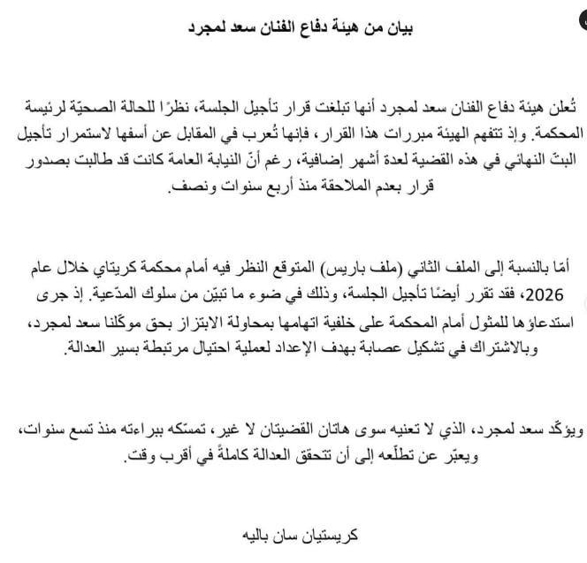 أصدرت هيئة دفاع المطرب المغربي سعد لمجرد بيانًا بعد تأجيل محاكمته استئناف الحكم الصادر بحقه بالسجن 6 سنوات بتهمة الاعتداء جنسي، وذلك أمام إحدى المحاكم في جنوب فرنسا اليوم الإثنين.