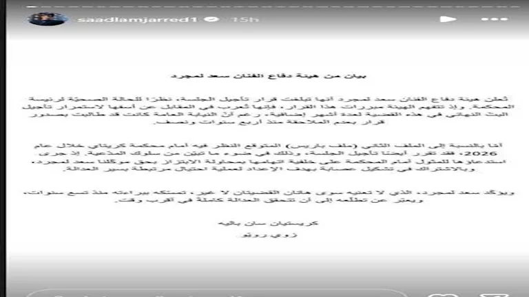 ونشر سعد لمجرد، عبر خاصية القصص في صفحته بموقع "إنستجرام"، نص البيان، وجاء فيه : “تعلن هيئة دفاع الفنان سعد لمجرد، إنها تبلغت بقرار تأجيل الجلسة، نظرا للحالة الصحية لرئيسة المحكمة، وإذ تتفهم الهيئة مبررات هذا القرار، فإنها تعرب في المقابل عن أسفها لاستمرار تأجيل البت النهائي في هذه القضية لعدة أشهر إضافية، رغم أن النيابة العامة كانت قد طالبت بصدور قرار بعدم الملاحقة منذ أربع سنوات ونصف”.