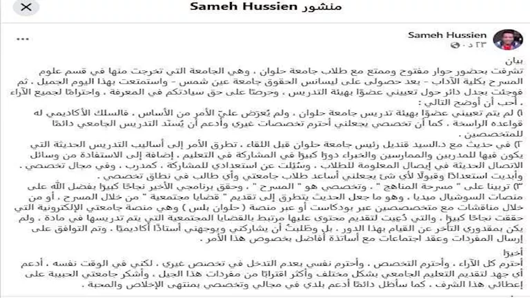 وقال سامح حسين في بيانه: "تشرفت بحضور حوار مفتوح وممتع مع طلاب جامعة حلوان، وهي الجامعة التي تخرجت منها في قسم علوم المسرح بكلية الآداب - بعد حصولي على ليسانس الحقوق جامعة عين شمس - واستمتعت بهذا اليوم الجميل، ثم فوجئت بجدل داِئر حول تعييني عضوًا بهيئة التدريس، وحرصًا على حق سيادتكم في المعرفة، واحترامًا لجميع الآراء، أحب أن أوضح"