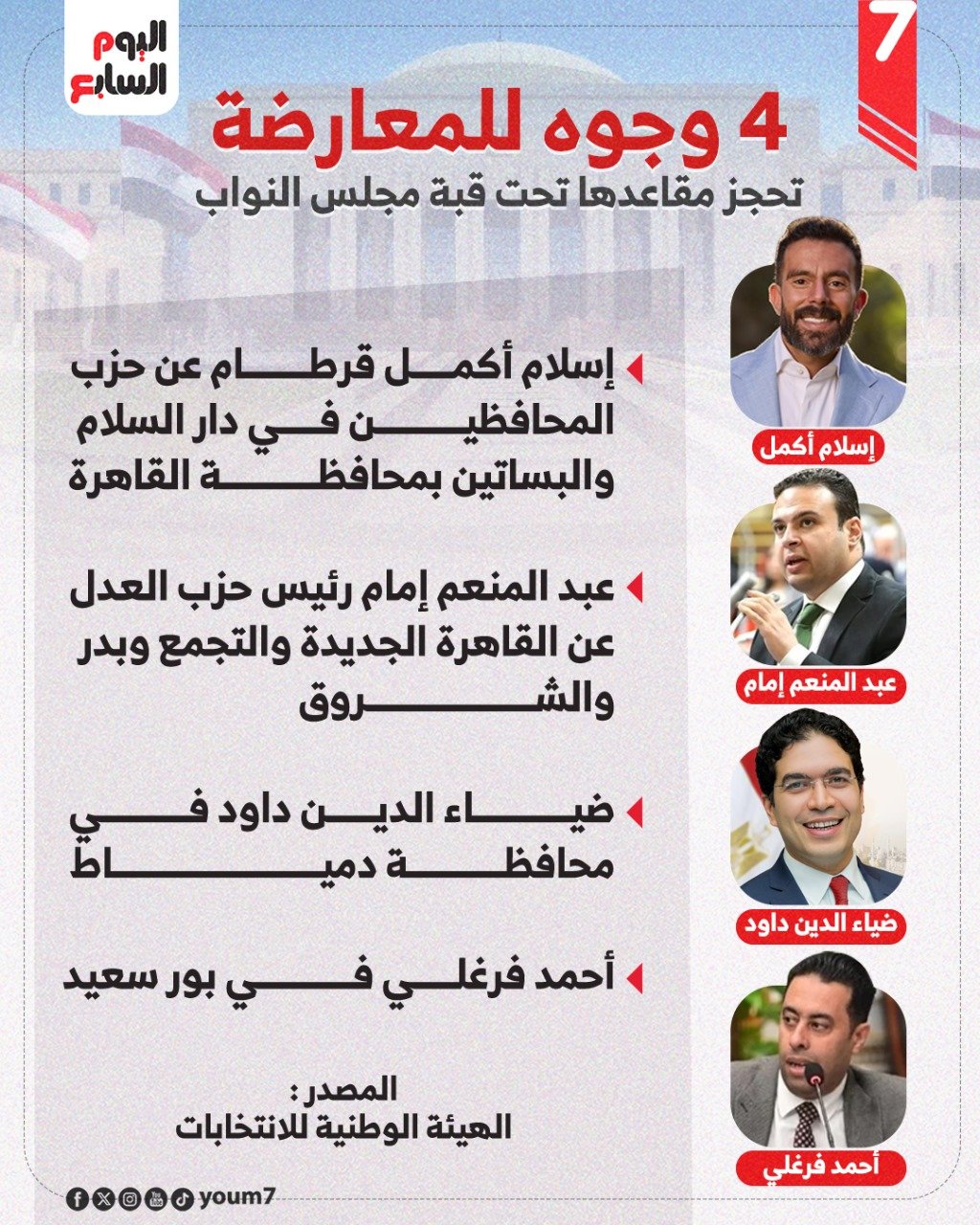 1- إسلام أكمل قرطام عن حزب المحافظين في دار السلام والبساتين بمحافظة القاهرة. 2- عبد المنعم إمام رئيس حزب العدل عن القاهرة الجديدة والتجمع وبدر والشروق. 3- ضياء الدين داود في محافظة دمياط. 4- أحمد فرغلي في بورسعيد.