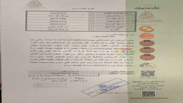 واختتم التقرير الطبي: "وتم نقله إلى العناية المركزة، ولكن توقّفت عضلة القلب للمرة الرابعة بعد نقله للعناية المركزة، وتم عمل إنعاش قلبي رئوي ولم تستجب الحالة، وحدثت الوفاة يوم 2025/12/2 الساعة 10:00 مساءً".