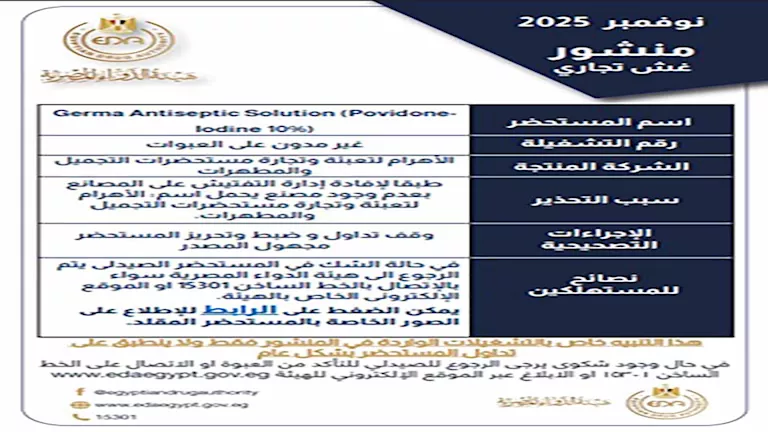كما أصدرت الهيئة منشورا رقم 91 لسنة 2025، للتحذير من وجود عبوات مجهولة المصدر تحمل اسم مستحضر "Germa Antiseptic Solution (Povidone Iodine 10%)"، وغير مدون أرقام التشغيلات.