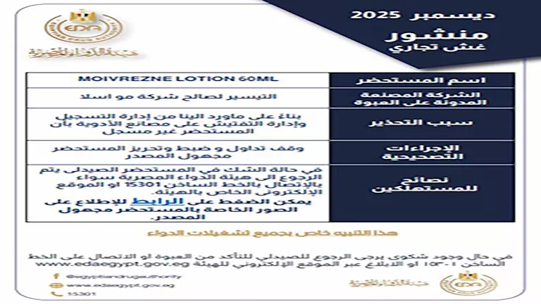 كما قررت الهيئة سحب عبوات من مستحضر "MOIVREZNE LOTION 60ML"، بناء على ما ورد من إدارتي التسجيل والتفتيش على مصانع الأدوية بأن المستحضر غير مسجل.