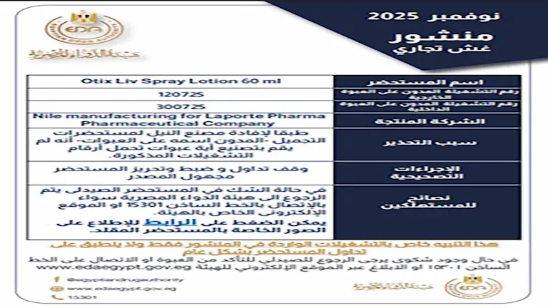 ففي منشور حمل رقم 90 لسنة 2025، حذرت الهيئة من عبوات مجهولة المصدر من مستحضر "Otix Liv Spray Lotion 60 ml"، برقم تشغيلة "120725"؛ طبقا لإفادة شركة النيل لمستحضرات التجميل، المدون اسمها على العبوات، أنها لم تقم بتصنيع أي عبوات تحمل أرقام التشغيلات المذكورة.