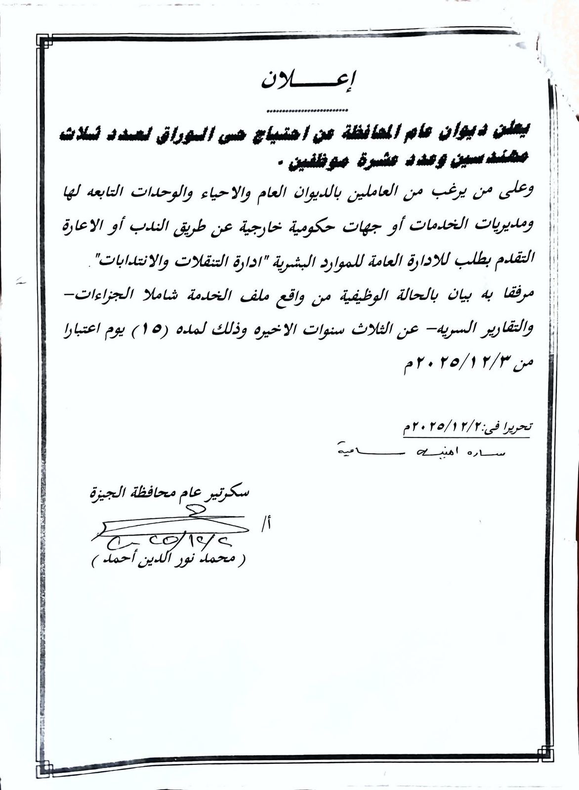 أعلن ديوان عام محافظة الجيزة ، احتياج حي الوراق لعدد 3 مهندسين و10 موظفين لسد العجز بالحي.