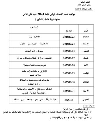 الموافق2025 /12/18، وتقدم الملفات إلى مكتب تعيينات أعضاء النيابة بدار القضاء العالى اعتباراً من يوم الثلاثاء الموافق 2025/12 / 23 وحتى يوم الخميس الموافق 1 /1/ 2026 من الساعة الثامنة صباحاً وحتى الساعة الرابعة مساءً يومياً. - للإناث: يطلب الملف اعتباراً من يوم السبت الموافق 2025/12 /20 وحتى يوم الخميس الموافق2025/12/25 وتقدم الملفات إلى مكتب تعيينات أعضاء النيابة بدار القضاء العالى اعتباراً من يوم السبت الموافق 2026 / 1 / 3 وحتى يوم الخميس الموافق 2026 /1/8 من الساعة الثامنة صباحاً وحتى الساعة الرابعة مساء يومياً.