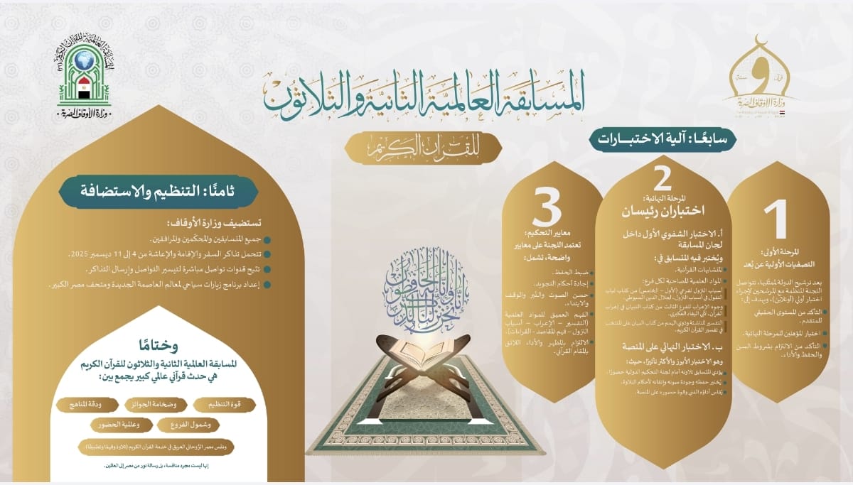 بالإضافة إلى جوائز تشجيعية بمجموع 850 ألف جنيه ، حيث تمثل المسابقة العالمية الثانية والثلاثون للقرآن الكريم إحدى أهم المسابقات القرآنية الدولية التى تنظمها وزارة الأوقاف المصرية سنويًا : إيمانًا بدور مصر الريادى فى خدمة كتاب الله ونشر ثقافته ومقاصده بين الشعوب.