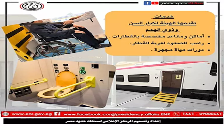 وتم رفع جودة الخدمة على متن القطارات حيث خصصت الهيئة أربع مقاعد بكل عربة في القطارات العادية لذوي الهمم مع وضع إرشادات واضحة بذلك.