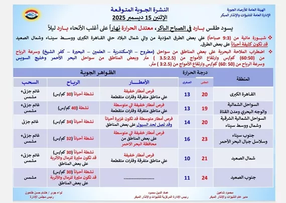 وبالنسبة لدرجات الحرارة، تسجل القاهرة الكبرى العظمى 20 درجة والصغرى 13 درجة، مع فرص لأمطار خفيفة على مناطق متفرقة. وتصل العظمى على السواحل الشمالية إلى 19 درجة والصغرى 13 درجة، مع فرص أمطار خفيفة إلى متوسطة على فترات متقطعة.