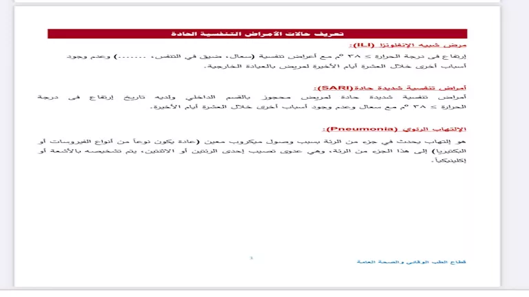 أما الأمراض التنفسية الحادة، فهي لمريض محجوز بالقسم الداخلي ولديه تاريخ ارتفاع في درجة الحرارة أكبر من 38 درجة، مع سعال وعدم وجود أسباب أخرى خلال العشرة أيام الأخيرة.