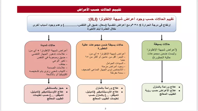 وفي إطار تقييم الحالات حسب الأعراض، أوضح الدليل الإرشادي تصنيف حالات الإصابة بأعراض شبيهة بالإنفلونزا، حيث تُقسم الحالات إلى ثلاث فئات رئيسية: