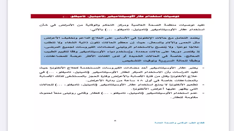 وتوصي الإرشادات ببدء العلاج المبكر بمضادات الفيروسات، وعلى رأسها الأوسيلتاميفير (تاميفلو) أو البدائل المتاحة، وفق الجرعات المحددة وتعليمات الطبيب المعالج، مع العلاج والراحة في المنزل، والمتابعة الدقيقة لأي مؤشرات تدل على تطور الأعراض، دون الحاجة إلى أخذ مسحة تشخيصية في هذه المرحلة.