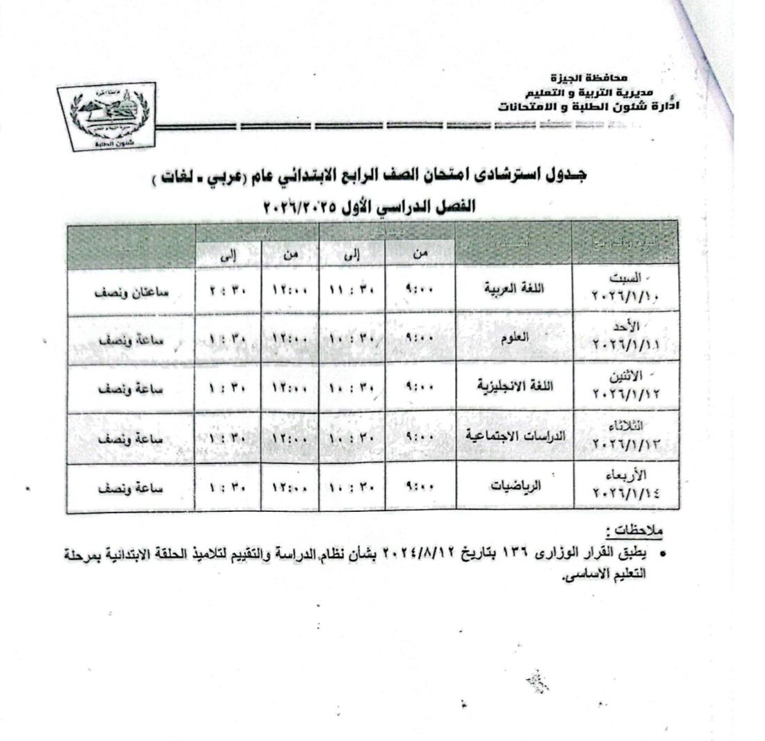 جدول امتحانات الفصل الدراسى الأول لطلاب الصف الرابع الابتدائى فى الجيزة