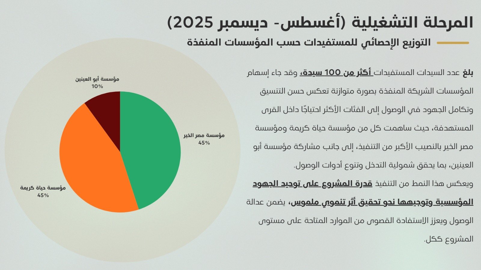 وأظهرت المؤشرات الختامية للمرحلة الأولى، والتي شملت الدُفعتين، كفاءة عالية ونتائج متميزة؛ حيث سجل متوسط معدل النفوق 3.75% فقط، بما يعكس تحقيق نسبة بقاء مرتفعة بلغت 96.25%، إلى جانب الالتزام بجداول التحصينات بنسبة وصلت إلى 97.5%. كما بلغ متوسط نسبة رضا المستفيدات 97%، وانعكست هذه النتائج بشكل مباشر على تحسين المستوى المعيشي للأسر المستفيدة، إذ سجلت المبادرة زيادة في متوسط الدخل الأسري قُدرت بنحو 20% نتيجة الدعم الفني والمتابعة المستمرة.