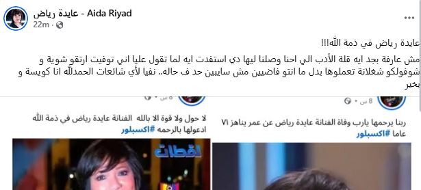 نشرت صفحة مزورة تحمل اسم الفنانة الكبيرة عايدة رياض شائعة وفاة الفنانة الكبيرة، ثم عادت الصفحة لتنفي الشائعة وتؤكد أن الفنانة على قيد الحياة وبخير، وذلك من أجل مزيد من التفاعل والريتش لزيادة أرباح الصفحة، حيث أكد الدكتور أشرف زكي نقيب المهن التمثيلية أن الصفحة مزورة ولا تتبع الفنانة الكبيرة عايدة رياض.