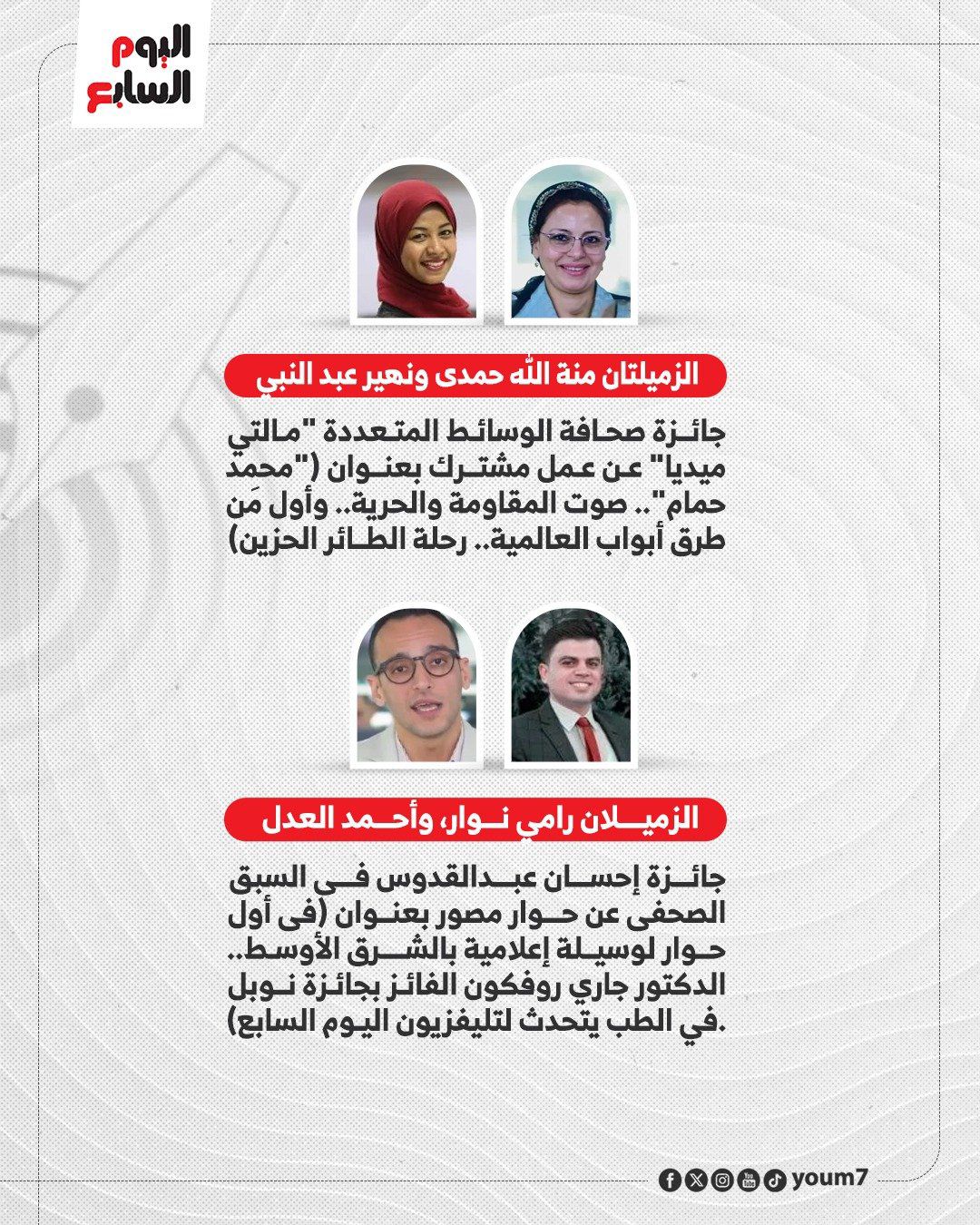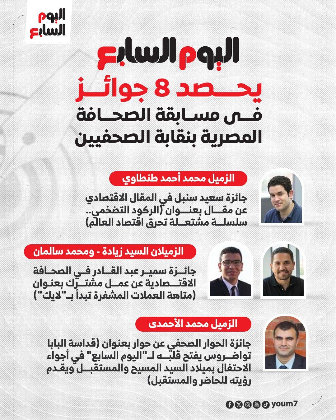 وحصدت "اليوم السابع"، 8 جوائز فى مسابقة جوائز الصحافة المصرية بنقابة الصحفيين ، "دورة محمود عوض 2025م" حيث حصل الزميل محمد الأحمدى جائزة الحوار الصحفى عن حوار بعنوان (قداسة البابا تواضروس يفتح قلبه لــ"اليوم السابع" فى أجواء الاحتفال بميلاد السيد المسيح والمستقبل ويقدم رؤيته للحاضر والمستقبل).